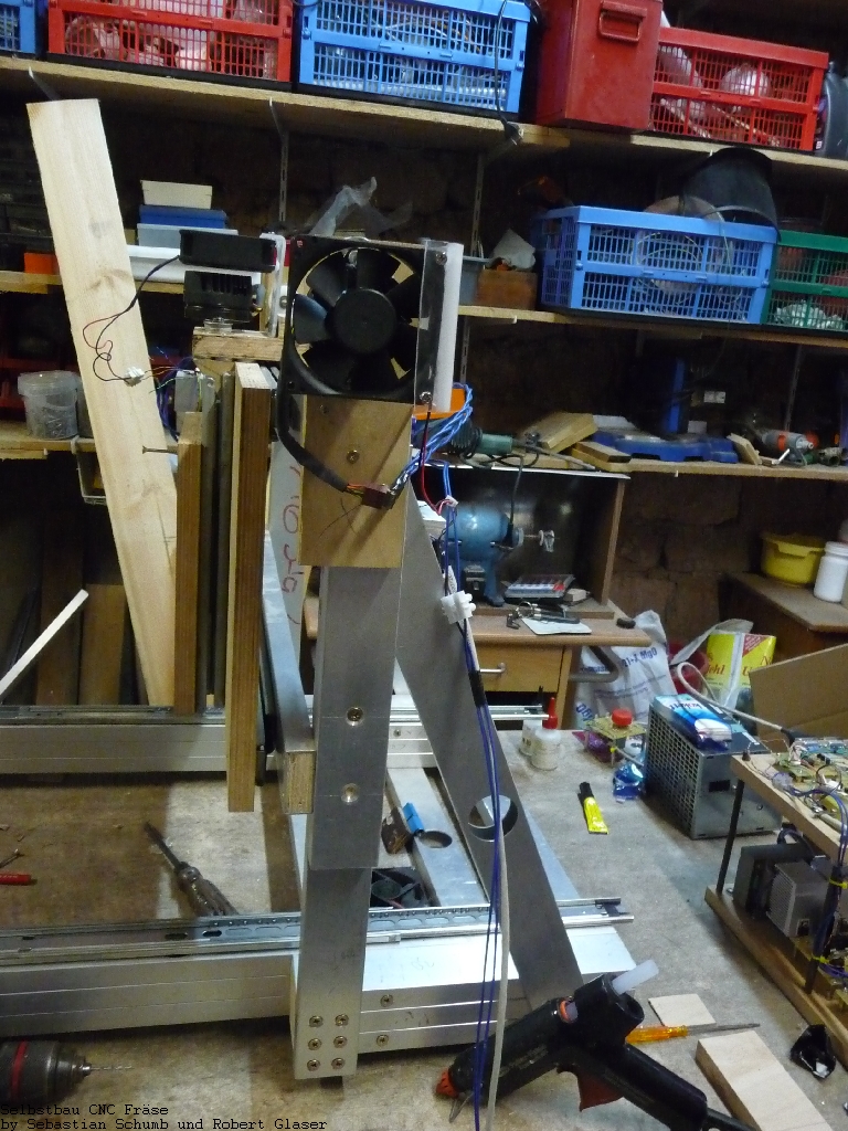 Die Profile wurden zugeschnitten und auf eine recht unorthodoxe Art und Weise verschraubt: Es war ja ursprünglich eine Holzfräse aus MDF geplant. Deshalb lagen jetzt noch etliche MDF-Platten in der Werkstatt herum. Diese wurden auf die Innenmaße der der Profile gebracht und in deren Enden gesteckt nachdem die Schraubenlöcher durch die Profile gebohrt wurden. Danach kann man die Teile mit einfachen Spaxx-Schrauben durch die MDF-Platten in den Profilen verschrauben.